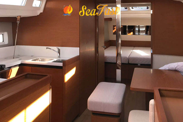 La barca è dotata di 4 cabine matrimoniali e una doppia a castello, un’ampia zona quadrato con tavolo da pranzo e divano, cucina attrezzata con forno, tavolo da carteggio con GPS interno dalle grandi dimensioni.
